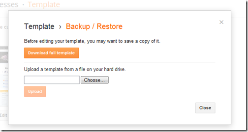5. A lightbox window will open with two options. First one ‘download full template’ is for making a backup of current template and second one ‘upload’ is for choosing a template from your computer and upload it to change the blogger theme.